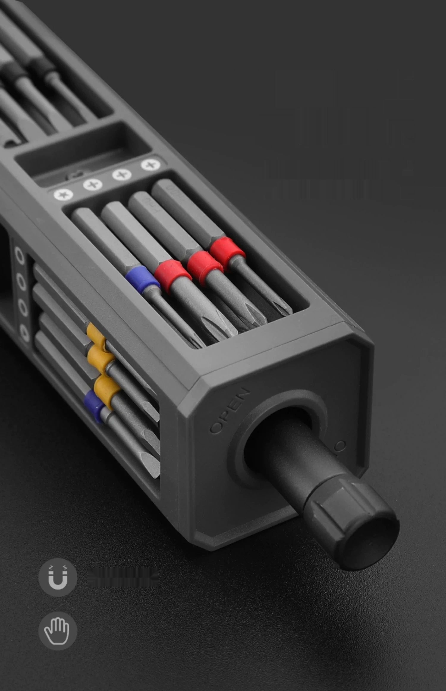MicroTorque uses a precision electric motor paired with 46 interchangeable S2 steel bits. The driver delivers stable torque and smooth control, while the strong magnetic core locks bits in place.